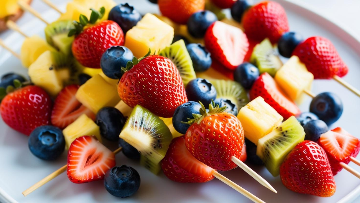 Frische, bunte Früchte aufgespießt für einen leichten und gesunden Snack. Perfekt für alle, die ein süßes, aber erfrischendes Dessert suchen.