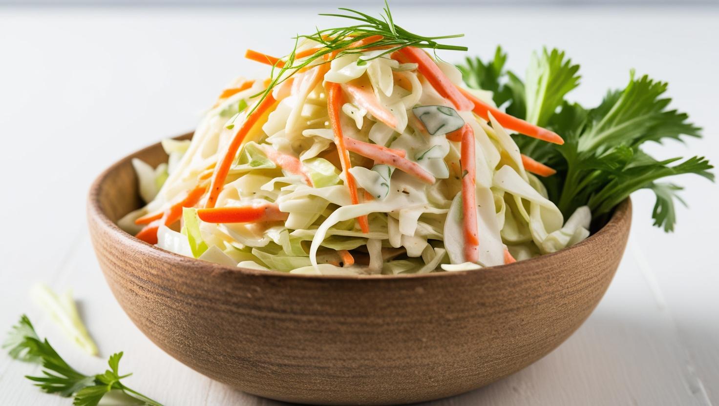 Frischer Krautsalat, der mit einer cremigen, leicht süßen Sauce angerichtet wird. Die knackige Textur des Kohls und die würzige Note machen ihn zu einer perfekten Beilage für jedes BBQ-Gericht.